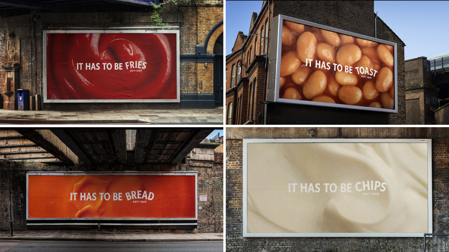 The tagline “It Has To Be” plays on a universal truth: Fries need ketchup, toast needs beans, chips need mayo, and bread goes hand in hand with soup. This is a masterclass in brand association, proving Heinz owns these food pairings. It’s bold, minimalist, and extremely effective.