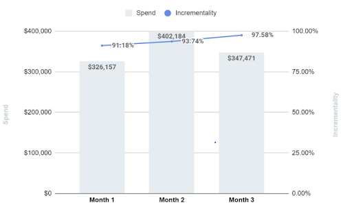 Month 1 shows Geist efforts reaching 91% incrementality, Month 2, 94% incrementality, and Month 3, 98%. This shows that on average of the three months, 93% of all last-touch conversions were driven by Geist’s efforts. Fiscally, of the $347,471 budget in Month 3, $340,521 was used to acquire new customers.