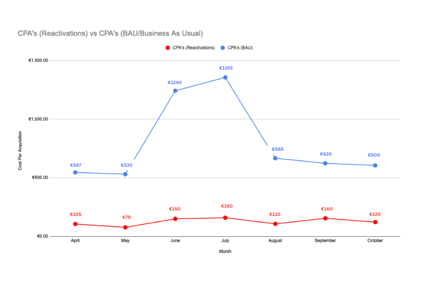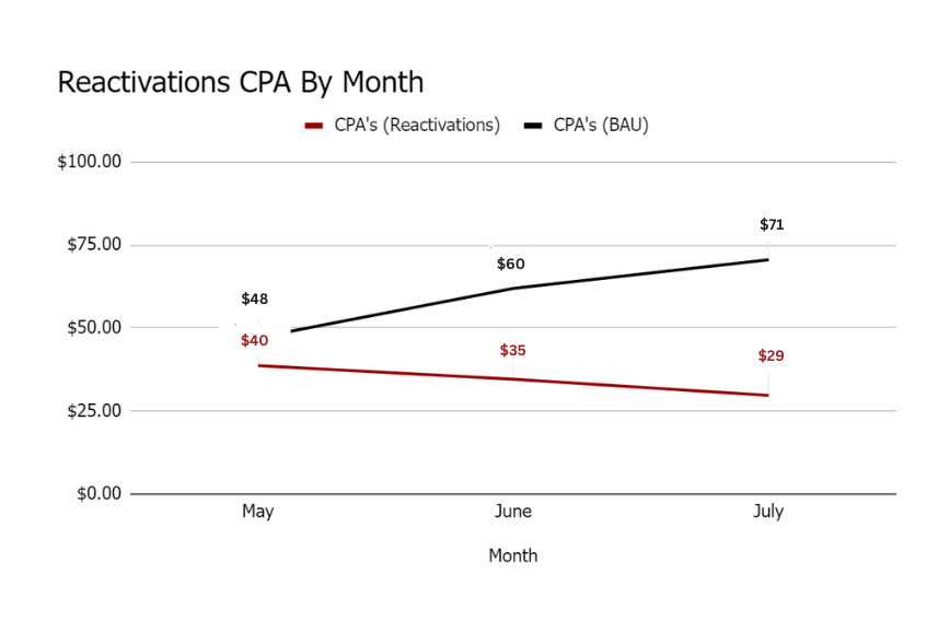 We saw that the overall cost per acquisition (CPA) for reactivating these dormant customers was roughly 80% lower compared to our traditional prospecting campaigns. This large reduction in CPAs highlighted the value of targeting customers who were already familiar with the brand and a metric that a general acquisition campaign could struggle to achieve.