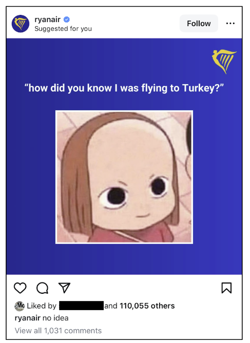 Ryanair has built a bold, cheeky brand voice that resonates with younger audiences who love brands with a sense of humor. This ad perfectly reflects that personality by using a meme and a clever caption that’s easy to understand, share, and in turn, go viral. It playfully references the popular trend of traveling to Turkey for hair transplants, using a character with exaggerated baldness as a subtle but hilarious nod — making it feel like an inside joke without directly saying it.