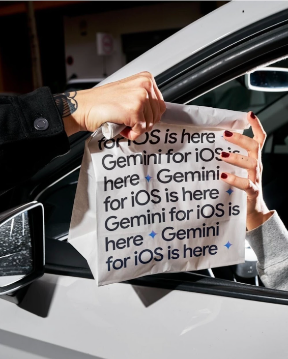 This ad stands out with its minimalist design, using bold, repetitive text to make sure the Gemini app’s release on iOS is impossible to miss. The clean look and simple typography match Google’s modern, polished branding perfectly. Showing a hand passing a bag through a car window adds a creative, relatable touch.